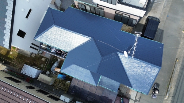 今まで現地調査の際には梯子でお客様のお家の屋根に上らせてもらいサイズの測定、劣化状況の確認を行っていました。ですが近年悪質なリフォーム業者に屋根に上られ、屋根を壊され必要のない工事をやらされたなどの話をよく耳にします。なので当社ではそのようなことを防ぎ少しでもお客様に安心安全を提供できるようにドローンによる空撮現地調査、測定を導入いたしました。